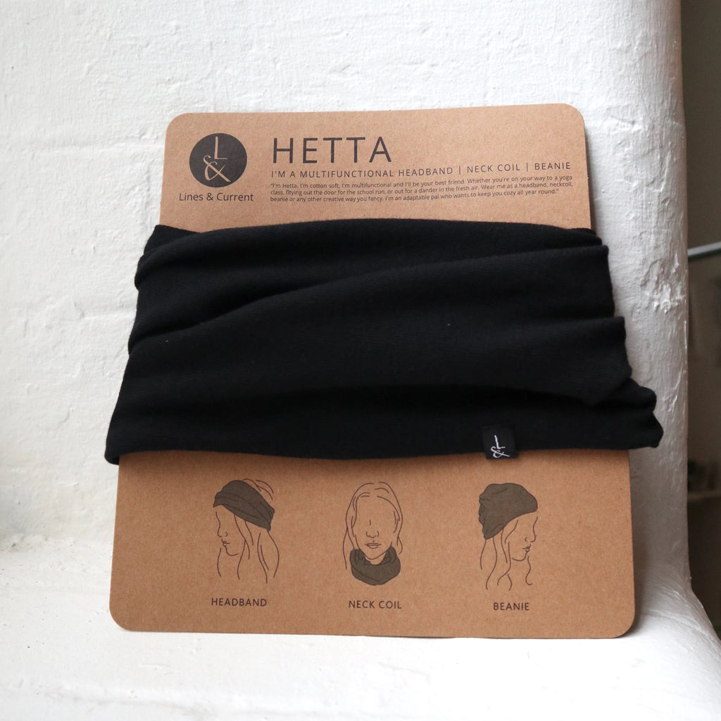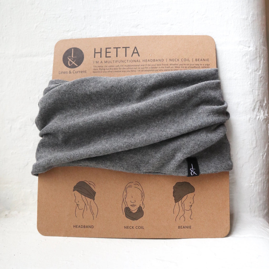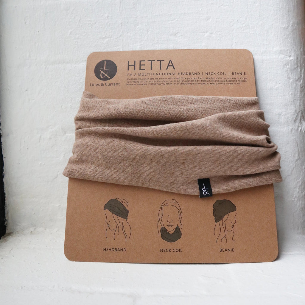 I'm Hetta. I'm cotton soft, I'm multifunctional and I'll be your best friend for the foreseeable. Whether you're on your way to a yoga class, flying out the door on the school run, or out for a dander in the fresh air. Wear me as a beanie, a headband, neck coil or any other creative way you fancy. I'll keep you cozy all year round