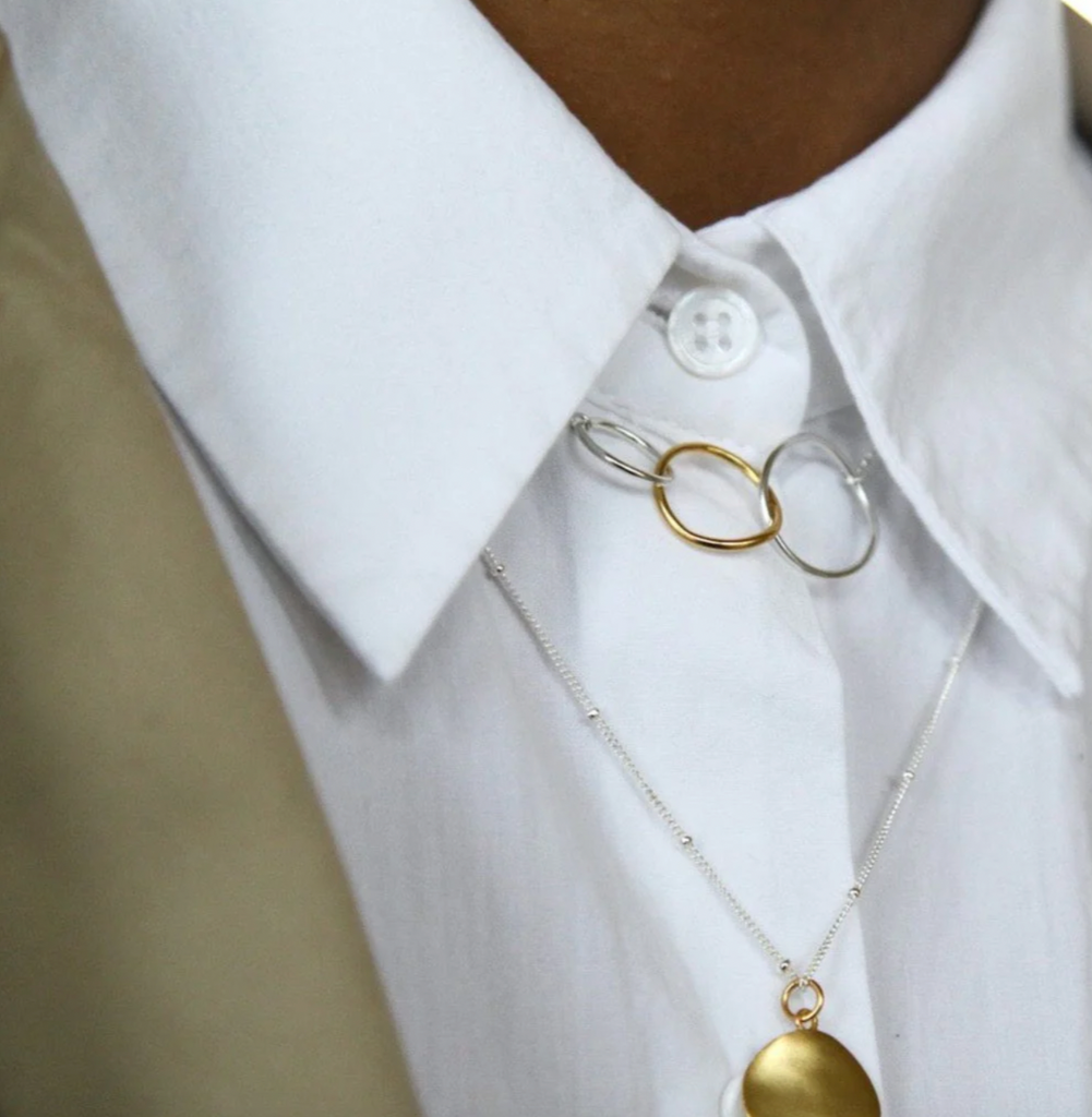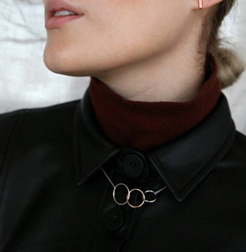 1mm thick interlocked, smooth open circles play together on a short to mid length chain. We're also mixing our metals cos we can't deny, it's just more fun that way! What would three interlocking circles mean to you?