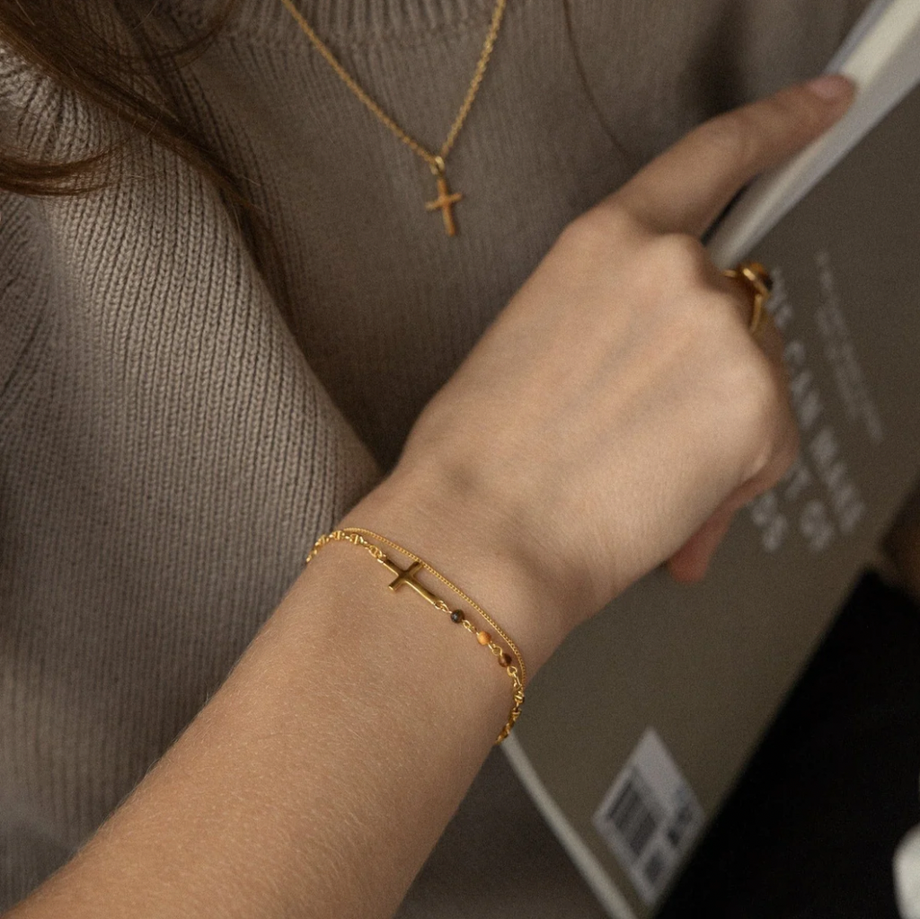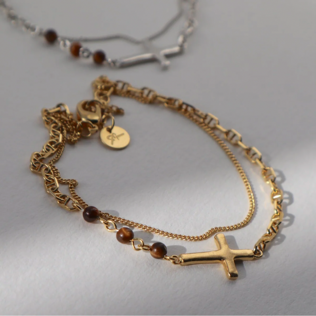 Has the look of two but it's just one. Say hi the new Cross double-stranded bracelet. An iconic symbol meets the earthiness of three mini Tiger's Eye beads with the function of 'two in one.'