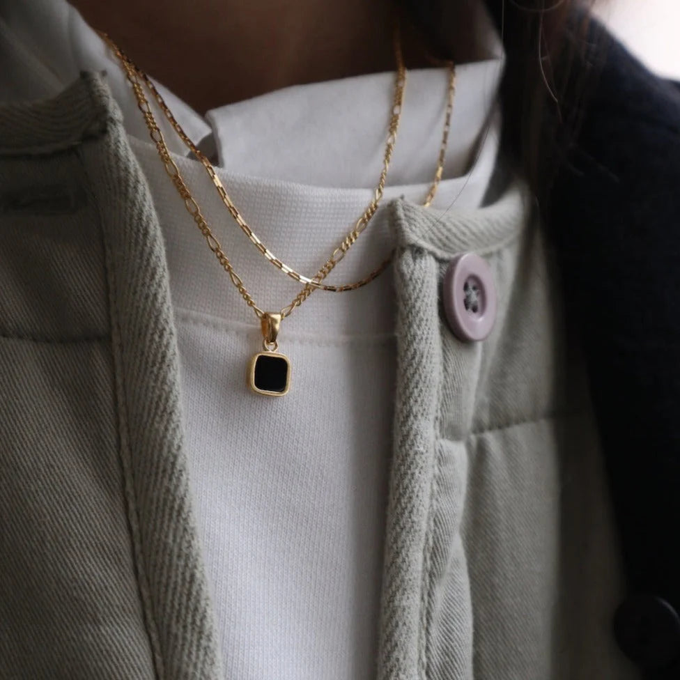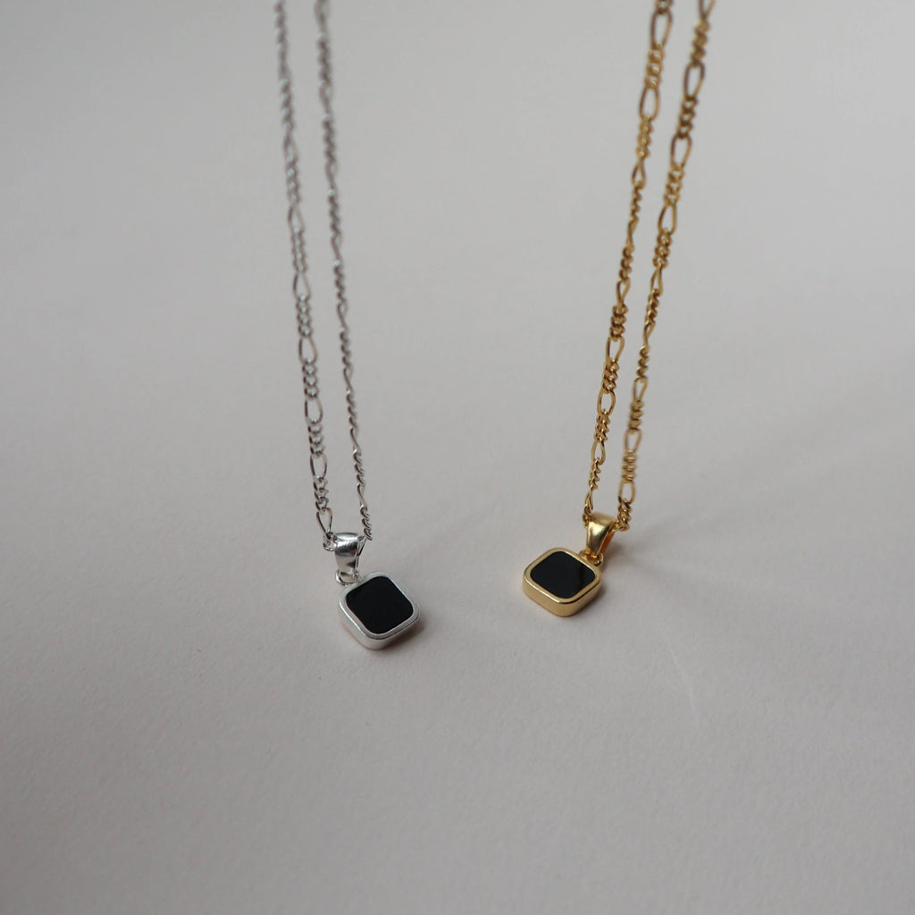 Marlowe, meaning 'river' calls for a return to the inner place. Like a river, we are deep and in this exploration under the surface, we often find the light. The dark Marlowe necklace chain has a softly curved square black square agate stone held in a 6mm by 6mm casing. Hung on our signature vintage bail loop with a 2mm figario chain.