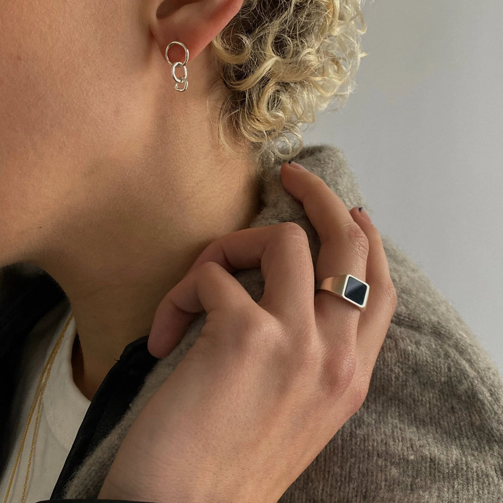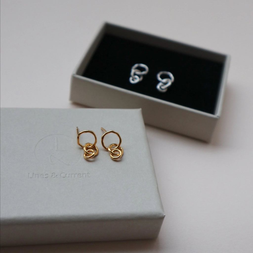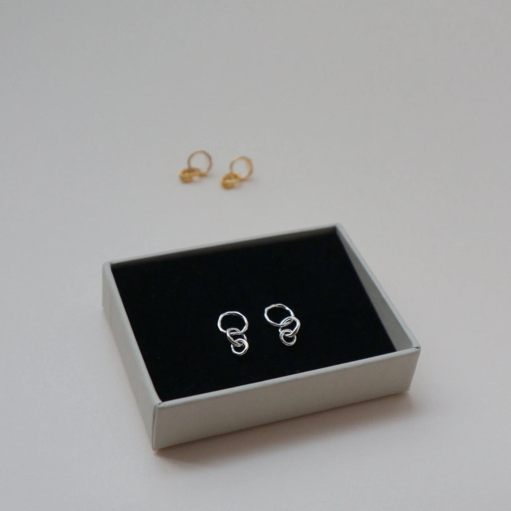 Three imperfect interlocked open circles. Fusing elements of minimalism with a LoFi everyday vibe, the 'Frieda' earrings are understated, happy lil' hanging studs that'll swing with you all day long.