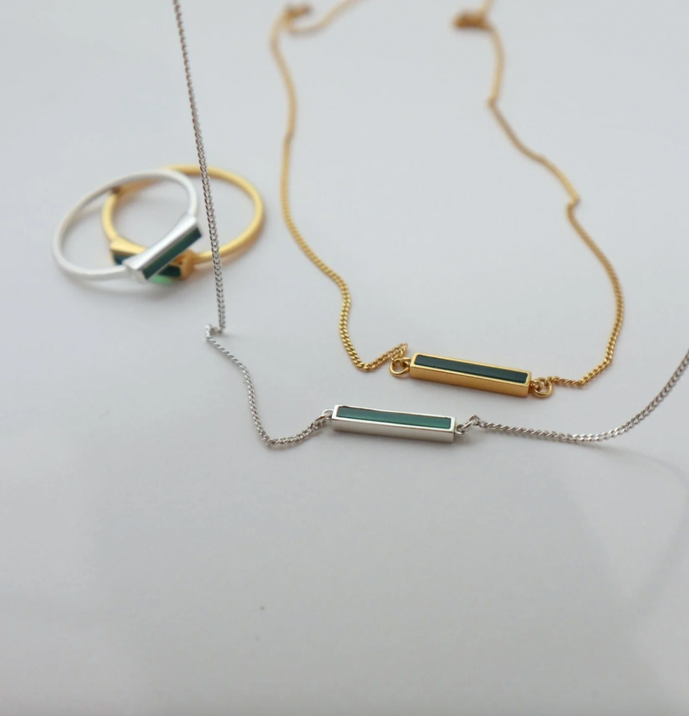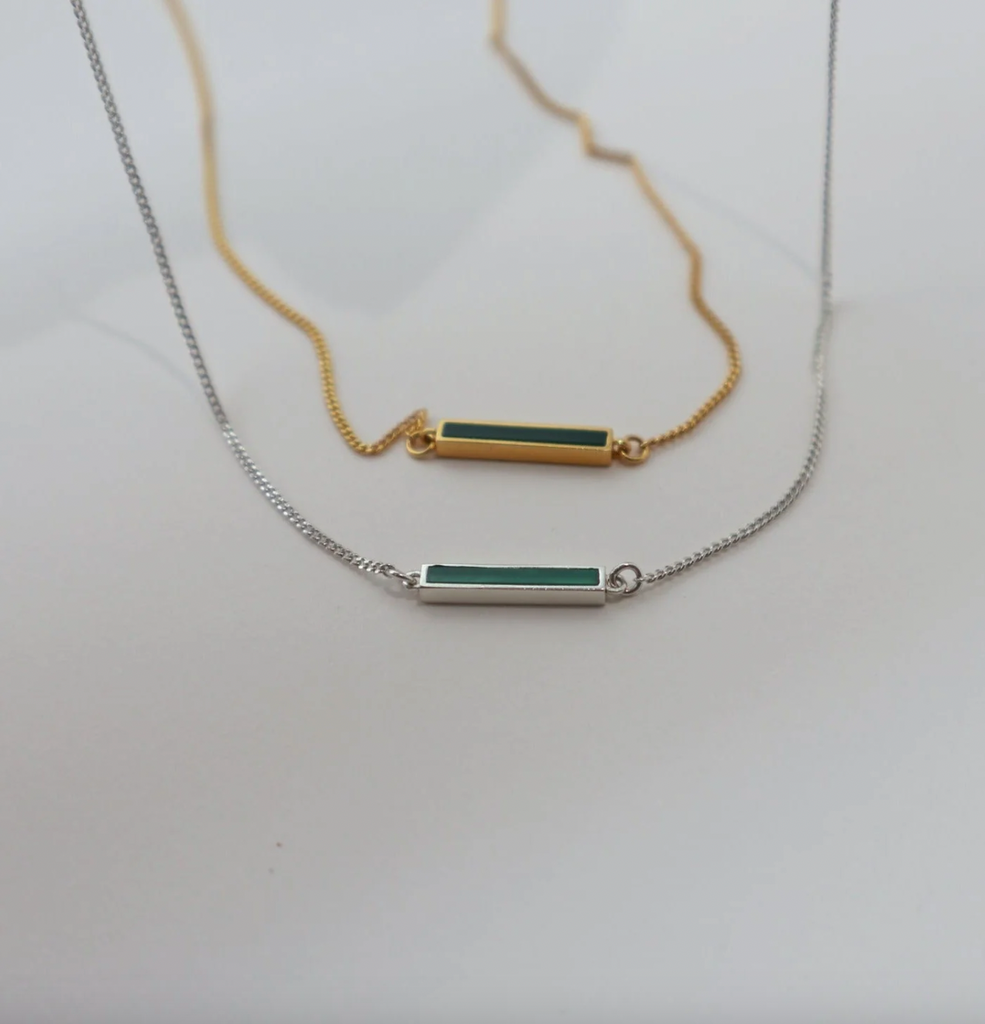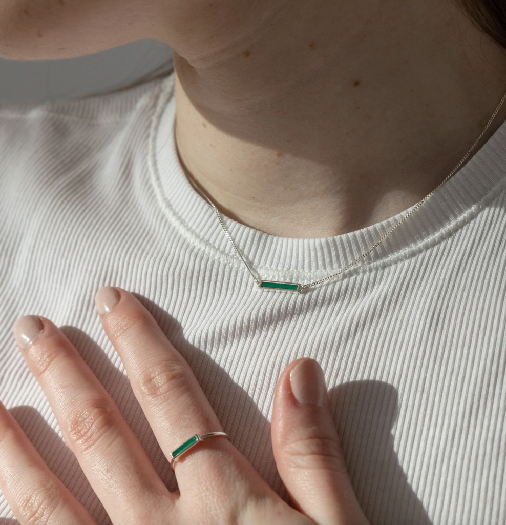 Alchemy, an ancient practice of transforming metals, except for us, it's a green alchemy where the simplicity of a skinny green agate baguette on fine chain is a reminder that transformation can be found in the most simple of practices. With agate, traditionally known for its ability to convert negative energy into something constructive, this minimalist chain acknowledges virtue in 'simplicity' and the transformational beauty of the 'discreet.' Where's all our green alchemists at?