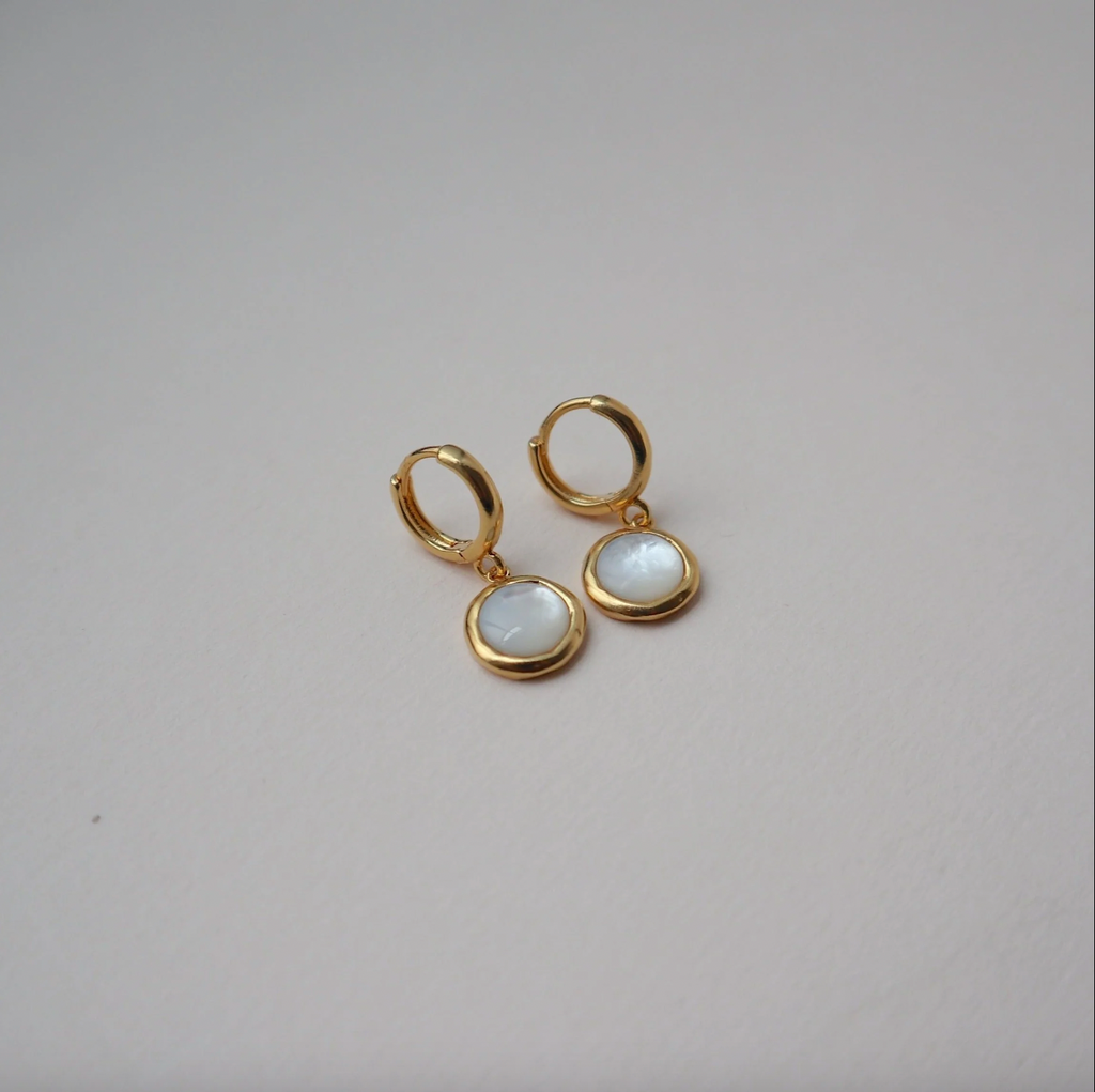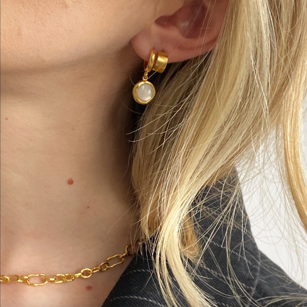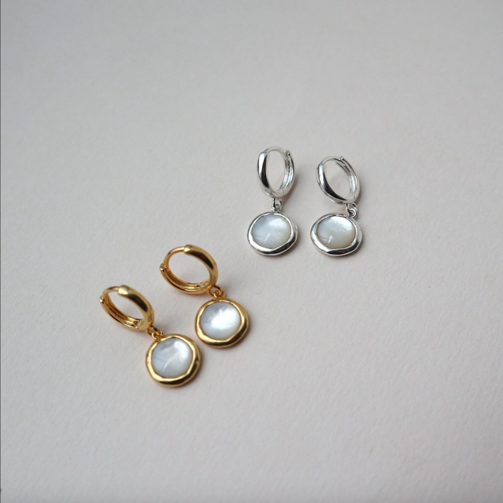 A smooth iridescent shell set in a circular molton case attached to a simple huggie earring. In harmony with the earth and rhythms of the tide, Sigrid shell dances in the light, symbolising what it is to be worn down by grit yet come up shining more than before. She's got the spirit of an everyday earring with a lil' something 'extra; Sigrid's the 'glo-up' we've all experienced in 'jewellery form!'